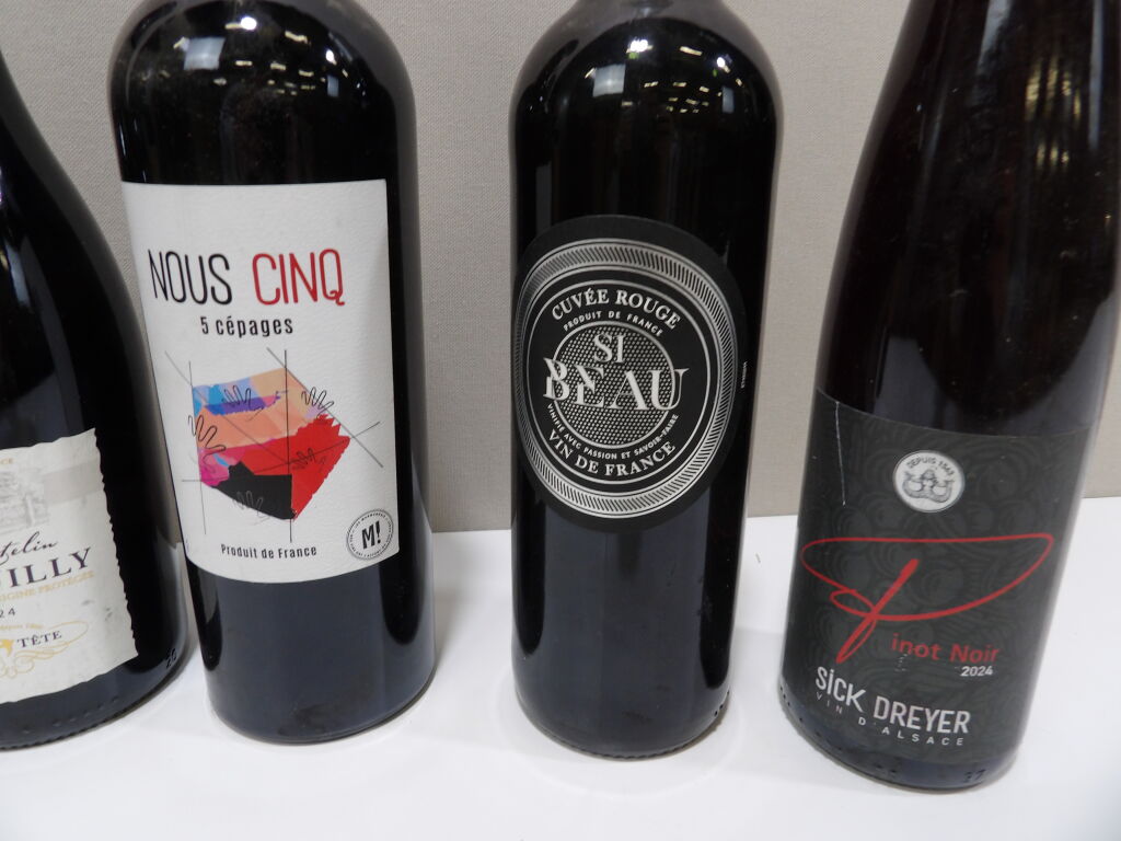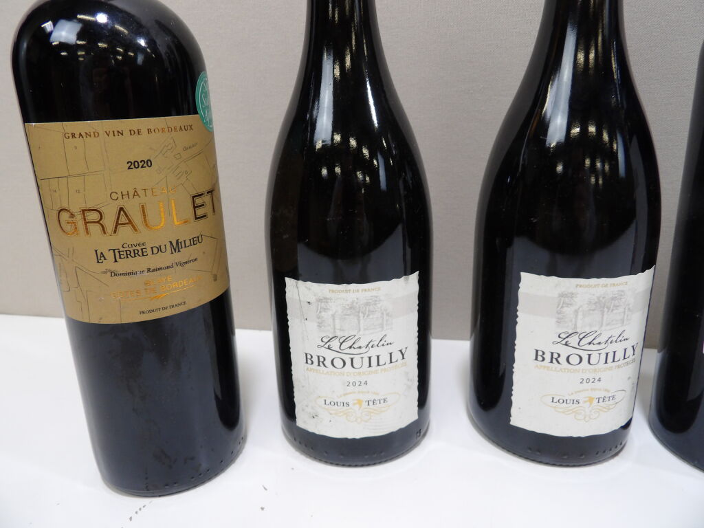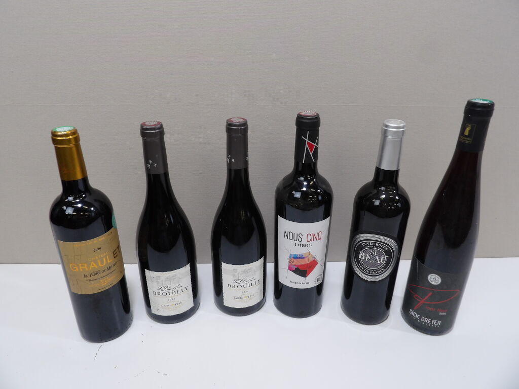 VINS ROUGE Tour d'Europe des Vins x6 bouteilles : x1 Blaye Côtes de Bordeaux Château Graulet 2020, x2 Le Chatelin de Brouilly 2024, x1 Cuvée rouge si Beau de Mainz 2024, x1 Pinot Noir d'Alsace 2024, et x1 NOUS CINQ de Cocumont.