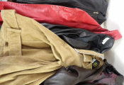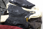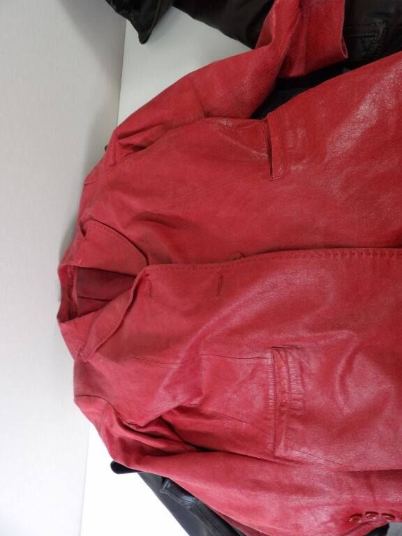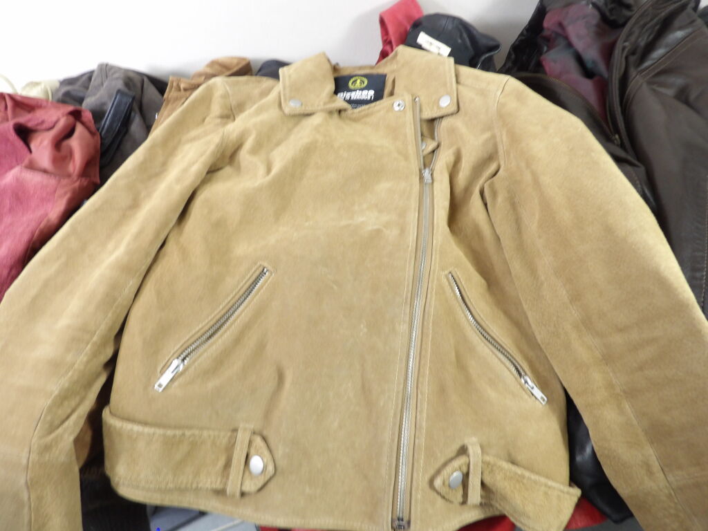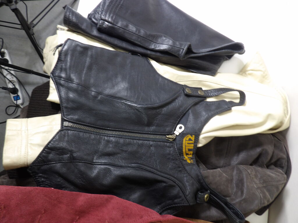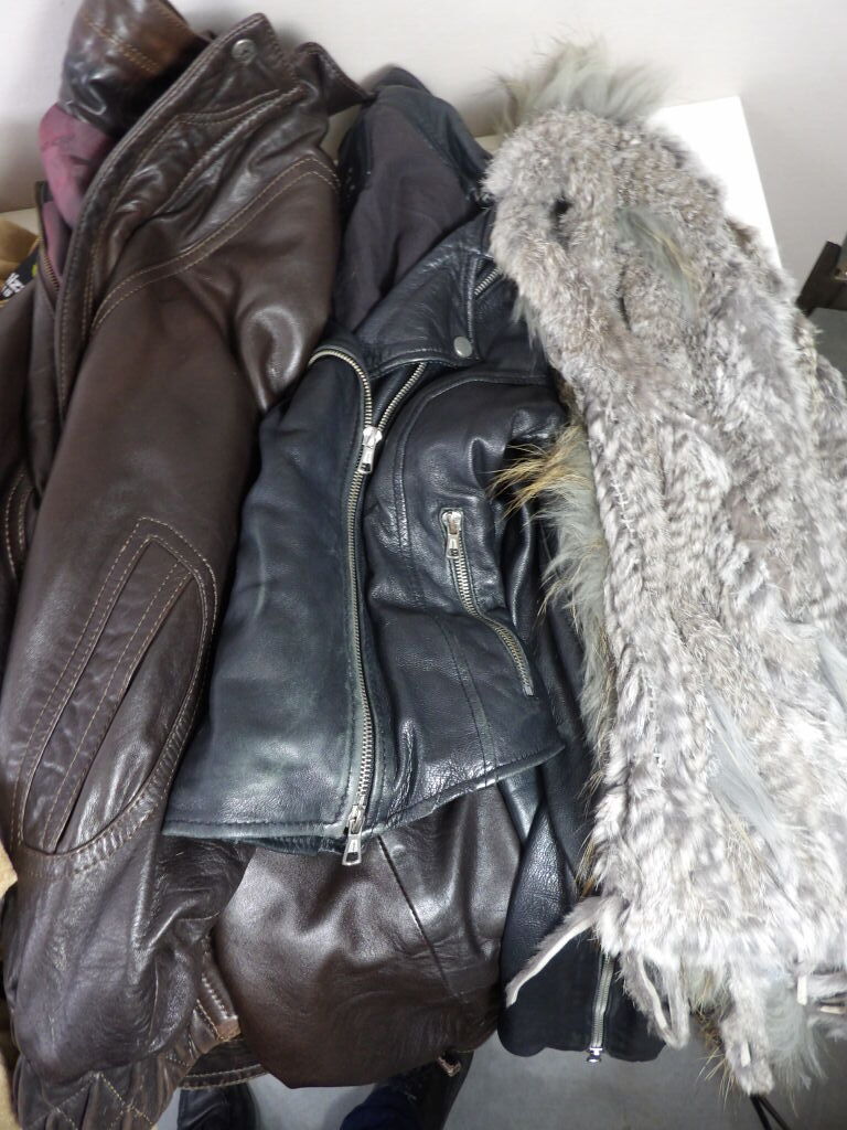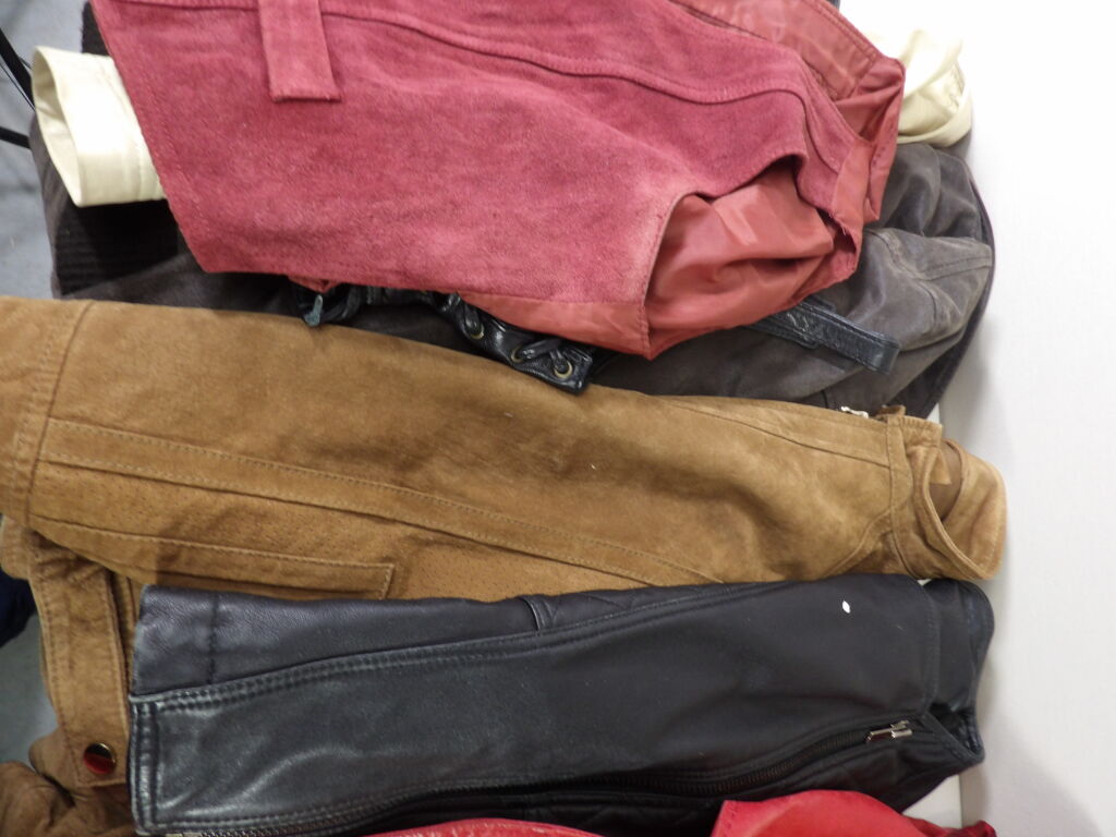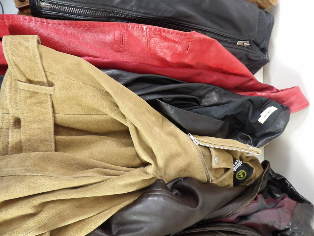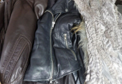 13 vêtements dont 12 en cuir d'occasion divers états divers tailles, divers marques dont Helmut Lang et une pièce en fourure (lapin ?)...