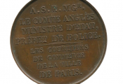 1818 - MEDAILLE des " COURTIERS de COMMERCE de la ville de PARIS, HOMMAGE à " A.S.E. MGr LE COMTE ANGLES ( * ) / MINISTRE D'ETAT : PREFET de POLICE ". - Avers : Mercure tenant un caducée et une bourse, assis sur un colis, proue de bateau au second plan, à droite coq chantant ; à l'exergue : M.D.XVIII, signature médailleur Galle. Bronze - 41 mm - 40 grammes.