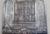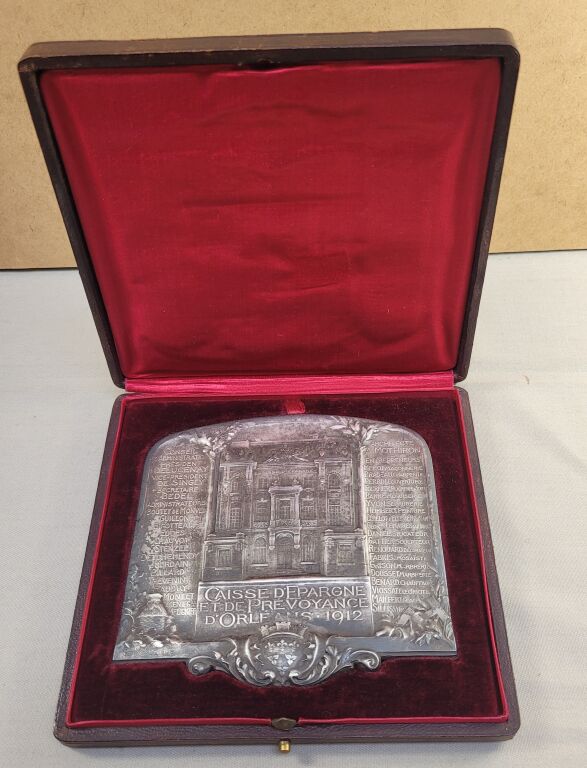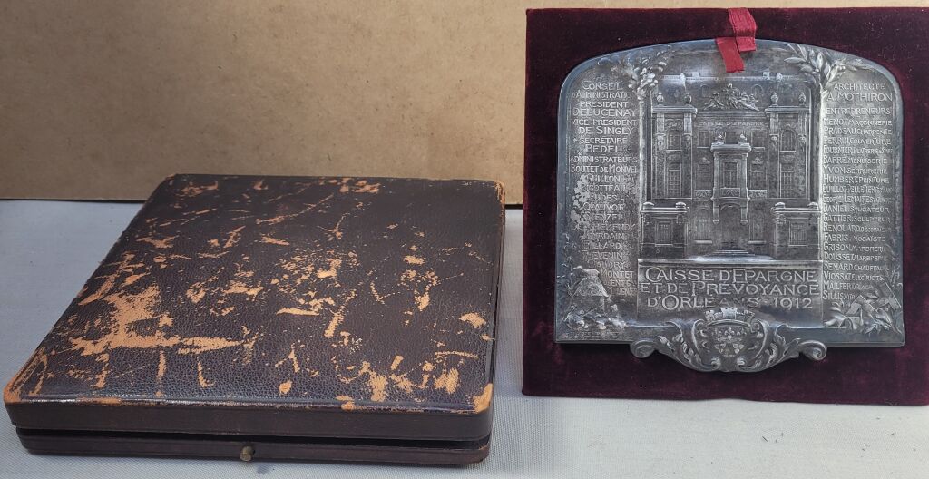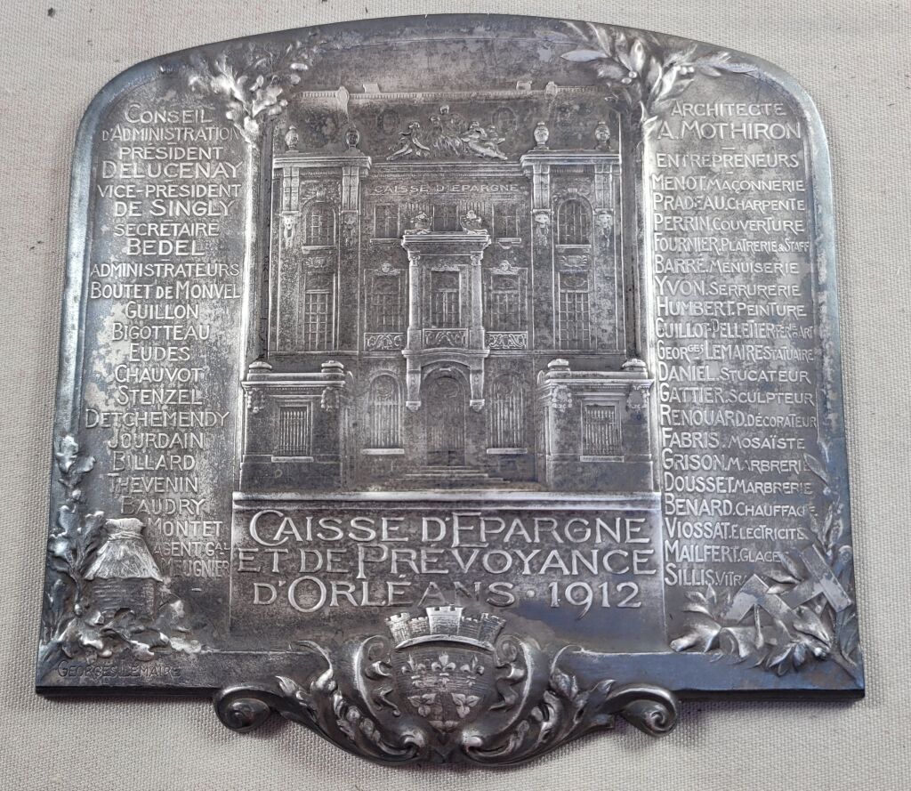 1912 - SPECTACULAIRE GRANDE PLAQUE INAUGURATION de la CAISSE D' EPARGNE D'ORLEANS - en centre la façade de l'hôtel de la Caisse d'Épargne, rue d'Excures ; en dessous marquage " CAISSE D'EPARGNE et de PREVOYANCE D'ORLEANS 1912 ".