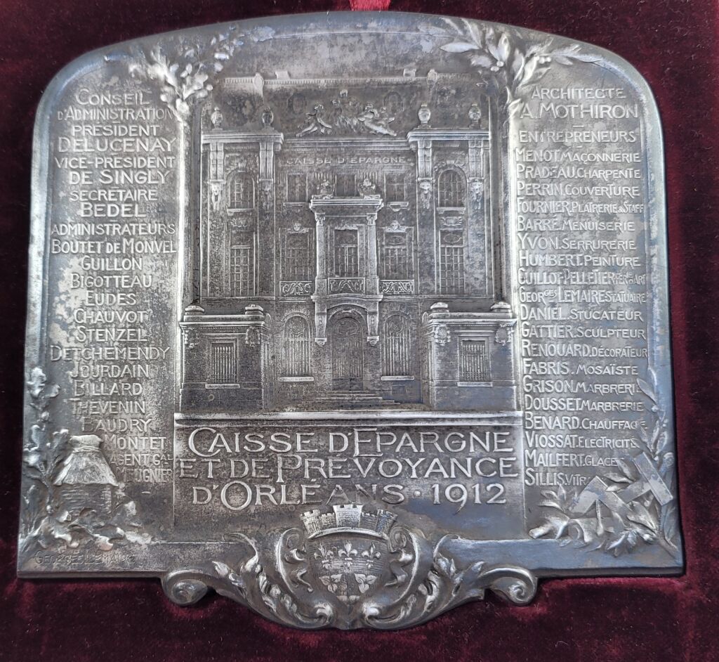 A l'exergue blason d'orléans entre 2 volutes - A droite noms divers : architecte A. MOTHIRON et liste des entrepreneurs par corps de métier - A gauche : membres du conseil d'administration avec nom et titre - OEuvre en étain signée du sculpteur Georges LEMAIRE.