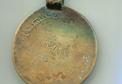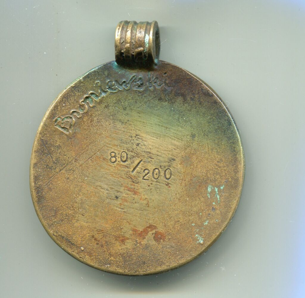 En centre Jeanne à cheval profil à gauche tenant son étendard - OEuvre du sculpteur Frédéric BRONIEWSKI ( * ) - Médaille avec bélière à tirage limité, numérotée 80 sur 200 avec signature de l'artiste en cursives en creux. Médaille haut relief coulée bronze.