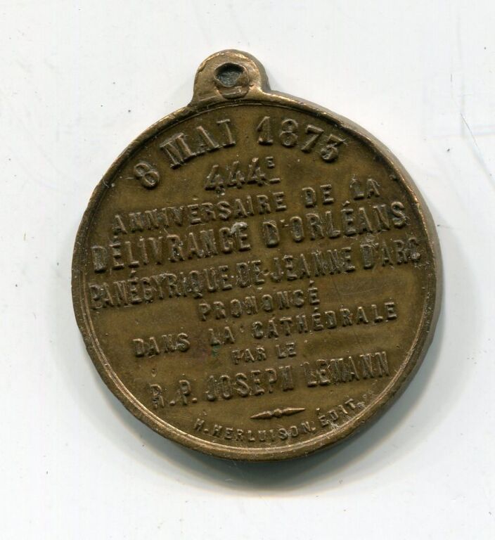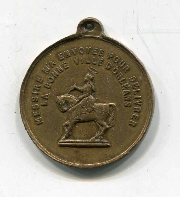 Au revers texte, au droit " MESSIRE M'A ENVOYEE POUR DELIVRER LA BONNE VILLE D'ORLEANS, statue équestre de Jeanne, profil à gauche, tenant épée, auréolée.