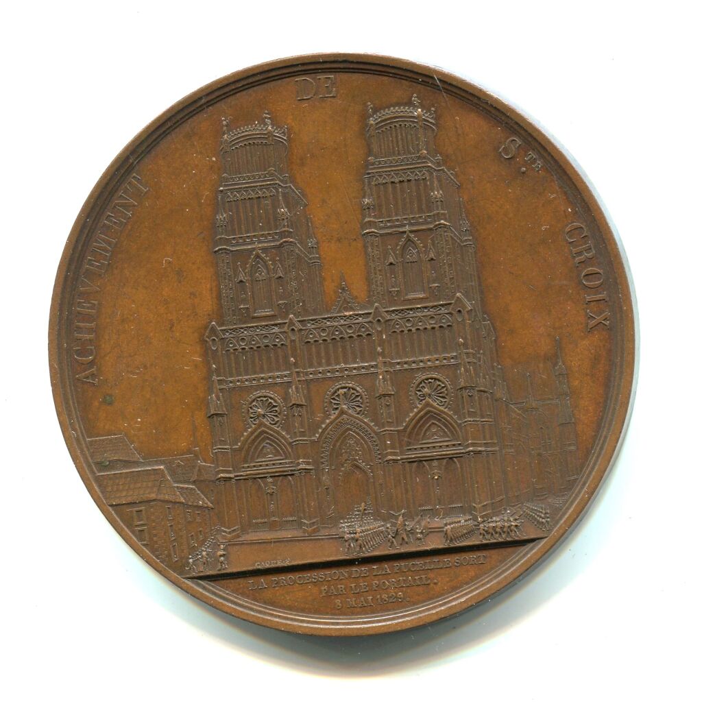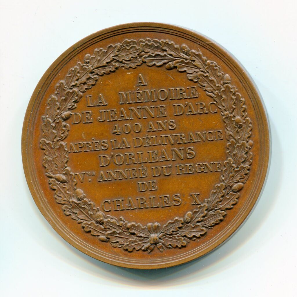 " ACHEVEMENT de la CATHEDRALE SAINTE CROIX ", grande médaille commémorative cuivre, 63 mm - La cathédrale d'Orléans vue de face en perspective animée de " la procession de la pucelle sort par le portail 8 mai 1839 - Revers, dans une couronne de feuilles de chêne et glands, texte 9 lignes : "A LA MEMOIRE de JEANNE D'ARC 400 ANS APRES LA DELIVRANCE D'ORLEANS Vme ANNEE du REGNE de CHARLES X ".
