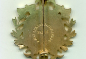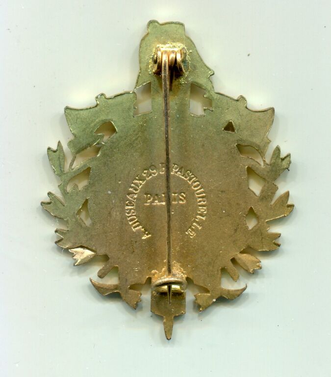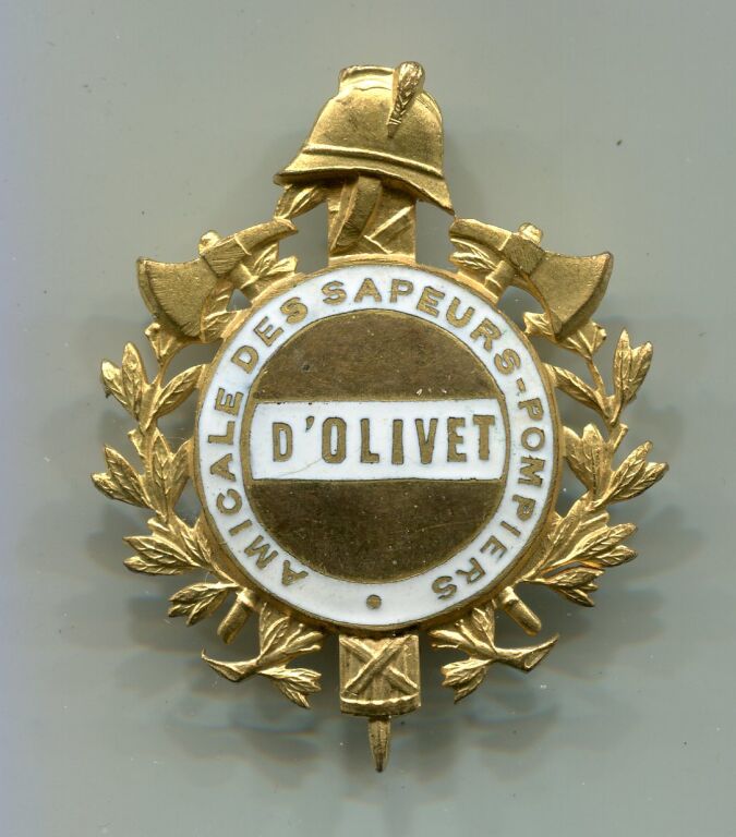 " AMICALE des SAPEURS POMPIERS D' OLIVET " de style insigne régimentaire militaire. En centre faisceau licteur coiffé d'in casque de pompier, 2 haches d'incendie et couronne de feuilles de laurier, le tout en métal doré, les inscriptions en pourtour émail grand feu blanc. Attache par épingle avec nom fabricant " A. DUSEAUX 29 rue Pastourelle PARIS ".