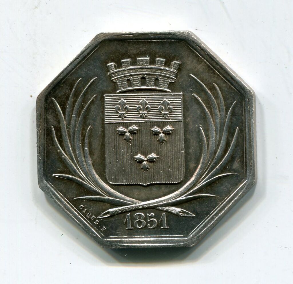 L/A n° 638. - 2 palmes entourent les armoiries d'Orléans, signature CAQUE F. - date 1851 à l'exergue. - revers : texte et composition : en centre Apollon, Dieu grec du jour personnification du soleil, symbole de la lumière purificatrice, et Hygie, déesse de la Santé groupés sur de gros nuages - Poinçon abeille (1860 à 1880) . TTB