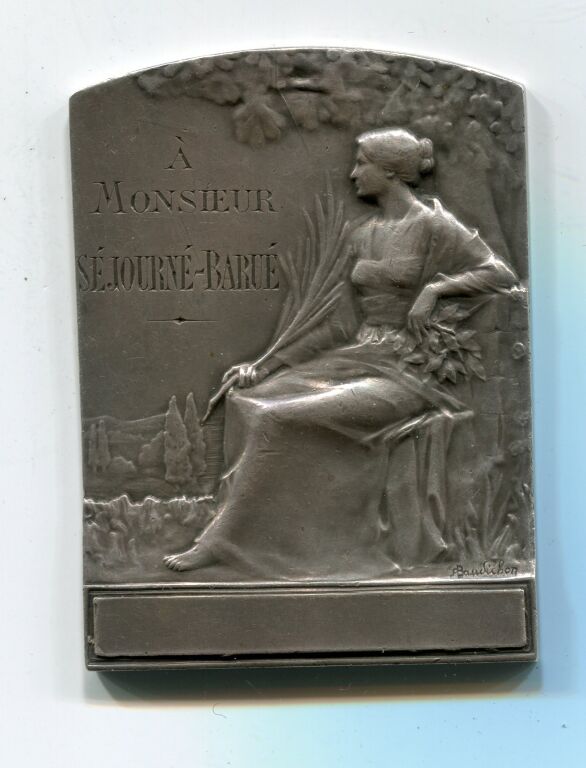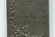 OEuvre du sculpteur R.BAUDICHON : la renommée sous forme d'une femme de profil, assise sous un chêne sur fond de paysage de campagne, tenant palme et branche de laurier ; à gauche gravure d'attribution " à Monsieur Séjourné-Barué ". - au revers au-dessus d'une palme de feuilles de chêne et laurier autre attribution " Syndicat des vins et vinaigres d'orléans 1881-1911". - 60 x 44 mm - 79,68 grammes - L/A n° 1880 - TTB