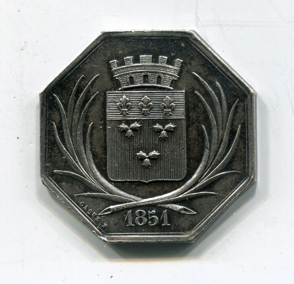 2 palmes entourent les armoiries d'Orléans, signature CAQUE F. - date 1851 à l'exergue. - revers : texte et composition : en centre Apollon, Dieu grec du jour personnification du soleil, symbole de la lumière purificatrice, et Hygie, déesse de la Santé groupés sur de gros nuages - Poinçon corne (à partir 1880) . TTB