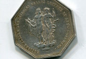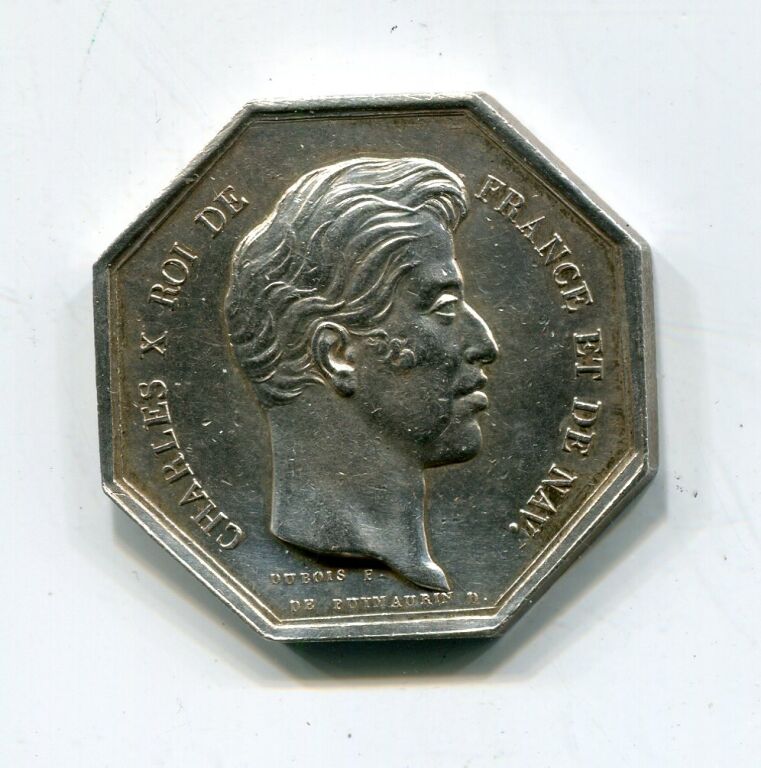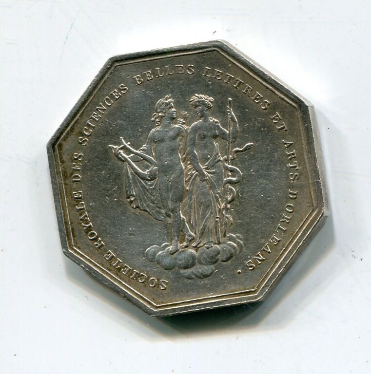 ARGENT - ARTS et BELLES LETTRES - " CHARLES X ROI de FRANCE ET DE NAV.", tête nue (variété cheveux plus hauts que France), profil à droite ; deux signatures sous le cou en bordure de listel : DUBOIS et DE PUYMAURIN - Revers : "SOCIETE ROYALE des SCIENCES, BELLES LETTRES et ARTS D'ORLEANS ", en centre Apollon, Dieu du jour et personnification du Soleil, symbole de la Lumière purificatrice et Hygie, déesse de la santé groupés sur un nuage réduit à quelques volutes. - Jeton octogonal 30 mm.