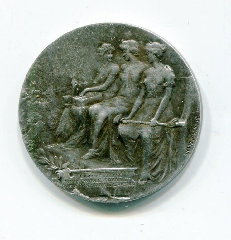 Trois femmes assises, au milieu la Mutualité, à droite l'Épargne une cassette sur les genoux et une ruche à ses pieds, à gauche le Travail, une masse dans les mains. Au fond vue de ville. Revers : " MUTUALITE sur soleil rayonnant - 9,87 grammes - L/A n° 1825 - TTB
