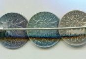 ARGENT - BIJOU MONETAIRE - BROCHE formée par trois pièces de 50 centimes de la Semeuse de Roty posée sur une épingle de sureté pour la fixation.
