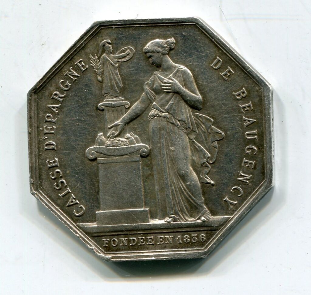 ARGENT - " CAISSE D'EPARGNE DE BEAUGENCY, fondée en 1836", la fortune vêtue à l'antique pose de la monnaie sur un autel surmonté d'une statue antique. Revers : " blason de ville couronné entre 2 banderoles inscrites "manibus date / lilia plenis " -