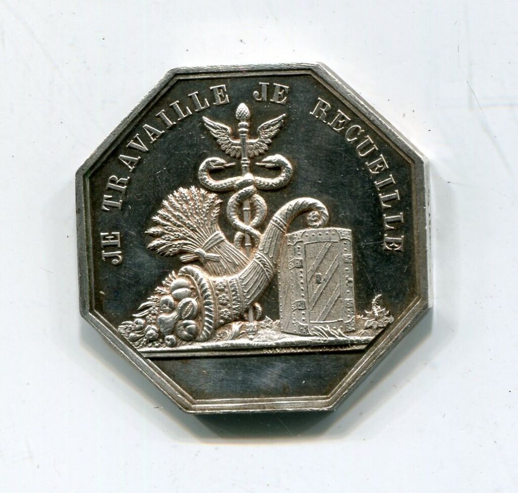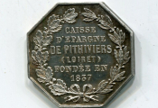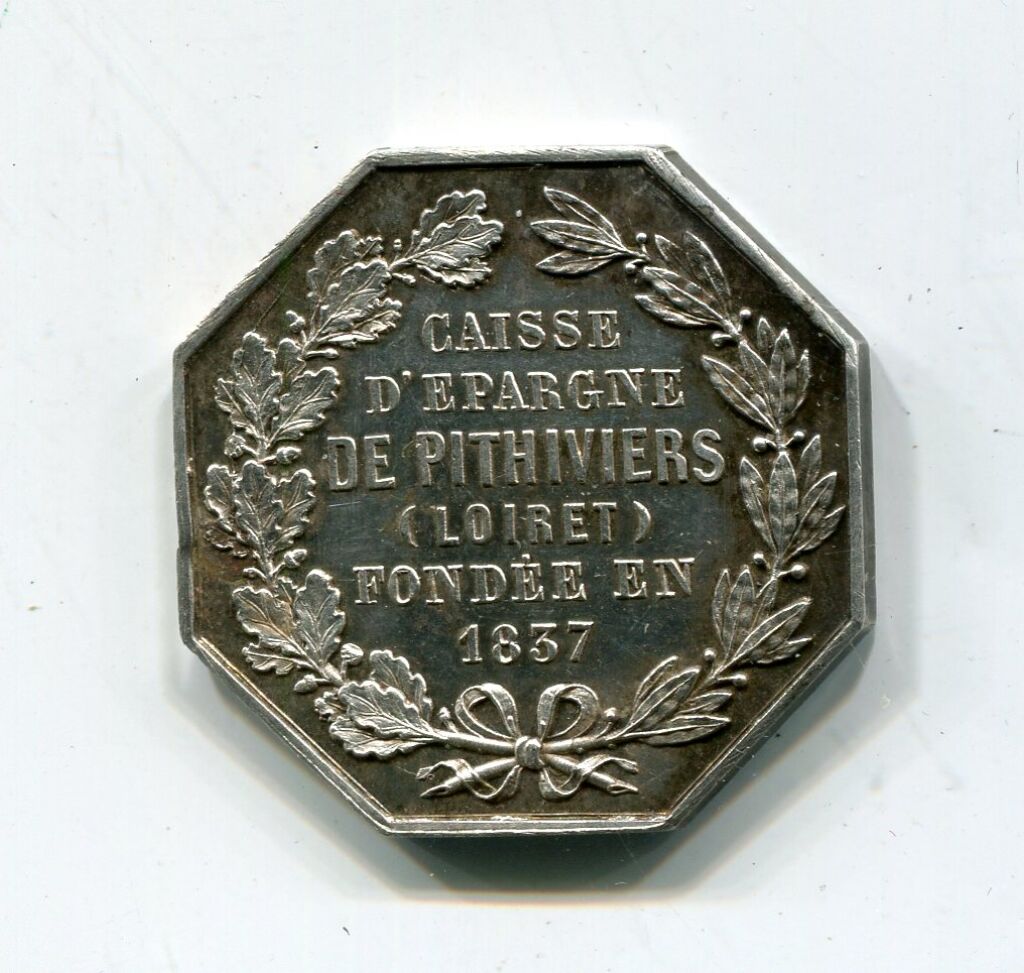 ARGENT - " CAISSE D'EPARGNE DE PITHIVIERS (LOIRET) fondée en 1837", texte en centre de deux palmes de feuilles de chêne et de laurier. Revers : " JE TRAVAILLE / JE RECUEILLE, corne d'abondance d'où sortent des fruits appuyée sur un coffre, gerbe de blé et caducée - jeton octogonal 29 mm -sur la tranche poinçons argent et corne d'abondance. - œuvre signée Bocquelay - 12,32 grammes - 31,5 mm - TTB