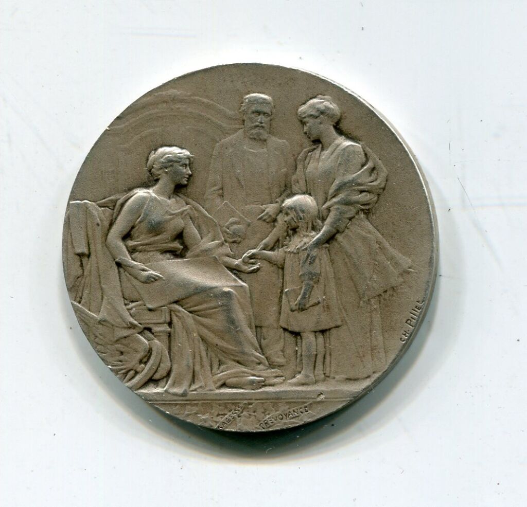Scène familiale, œuvre du sculpteur Charles PILLET, parents accompagnant leur fillette déposer de l'argent dans la main tendue d'une femme assise représentant la C.E. ; à l'exergue " Sagesse, Prévoyance ". - Revers : ruche posée sur une gerbe de blé et une corne d'abondance d'où s'échappent des fleurs - sur la tranche poinçons argent 1er titre et corne d'abondance. - 15,10 grammes - 31 mm - L/A n° 1970 b - TTB