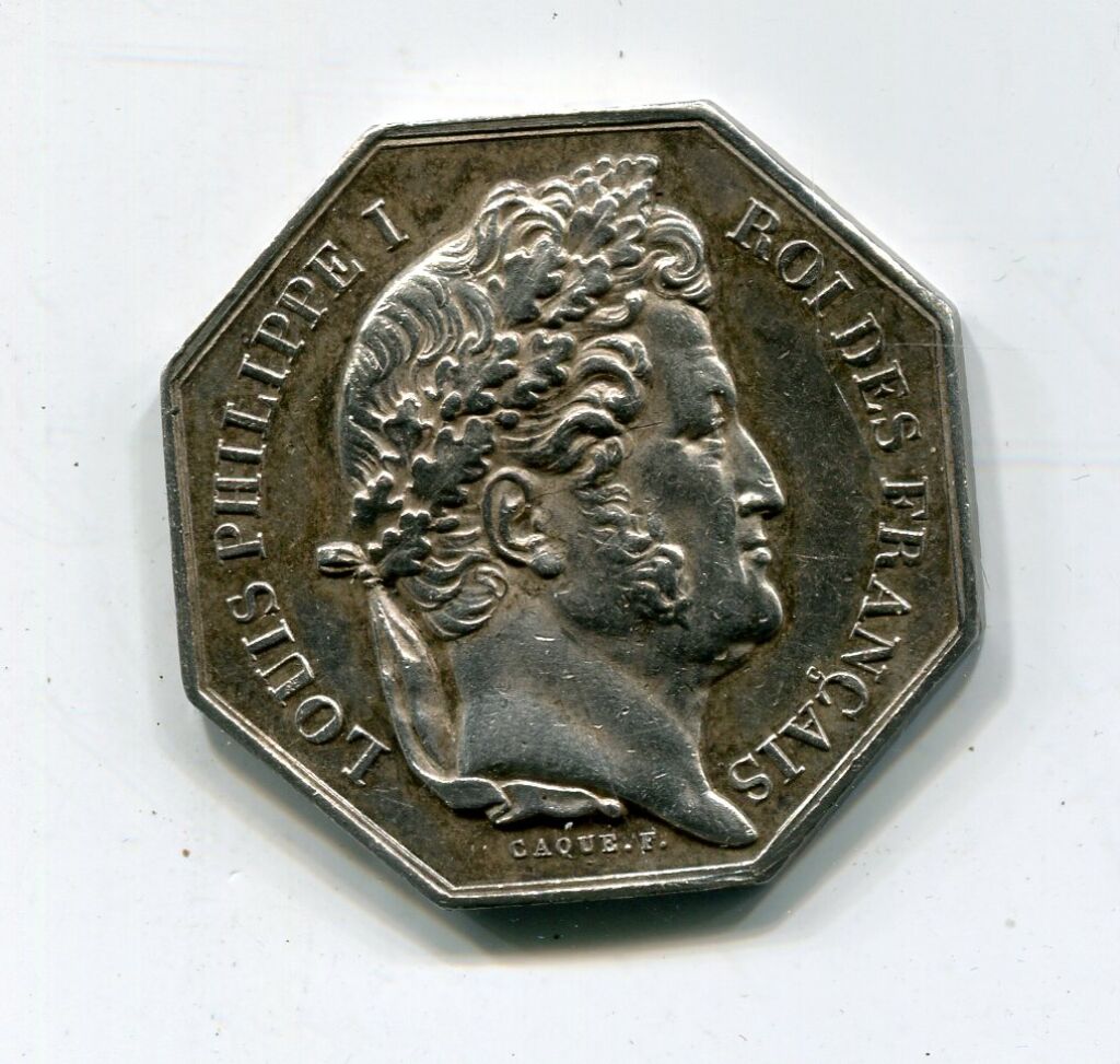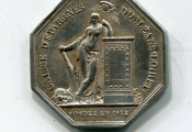 revers : Femme appuyée du coude gauche sur un coffre, la main gauche tenant une hampe surmontée d'un œil rayonnant et la main droite tenant une corne d'abondance d'où s'échappent des fruits - . Jeton octogonal 31 mm, 13,59 grammes.