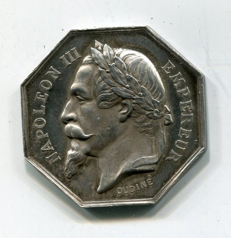 revers : Femme appuyée du coude gauche sur un coffre, la main gauche tenant une hampe surmontée d'un œil rayonnant et la main droite tenant une corne d'abondance d'où s'échappent des fruits - . Jeton octogonal 30,5 mm, 13,74 grammes.