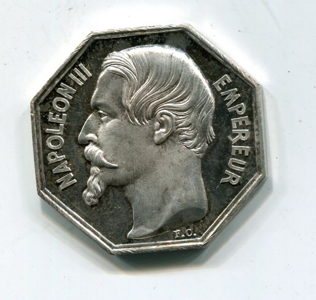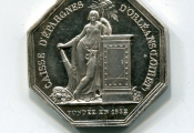 revers : Femme appuyée du coude gauche sur un coffre, la main gauche tenant une hampe surmontée d'un œil rayonnant et la main droite tenant une corne d'abondance d'où s'échappent des fruits - . Jeton octogonal 30,5 mm, 13,63 grammes.