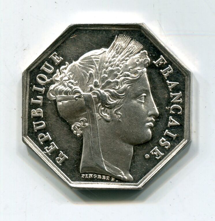 revers : Femme appuyée du coude gauche sur un coffre, la main gauche tenant une hampe surmontée d'un œil rayonnant et la main droite tenant une corne d'abondance d'où s'échappent des fruits - . Jeton octogonal 30,5 mm, 12,90 grammes.