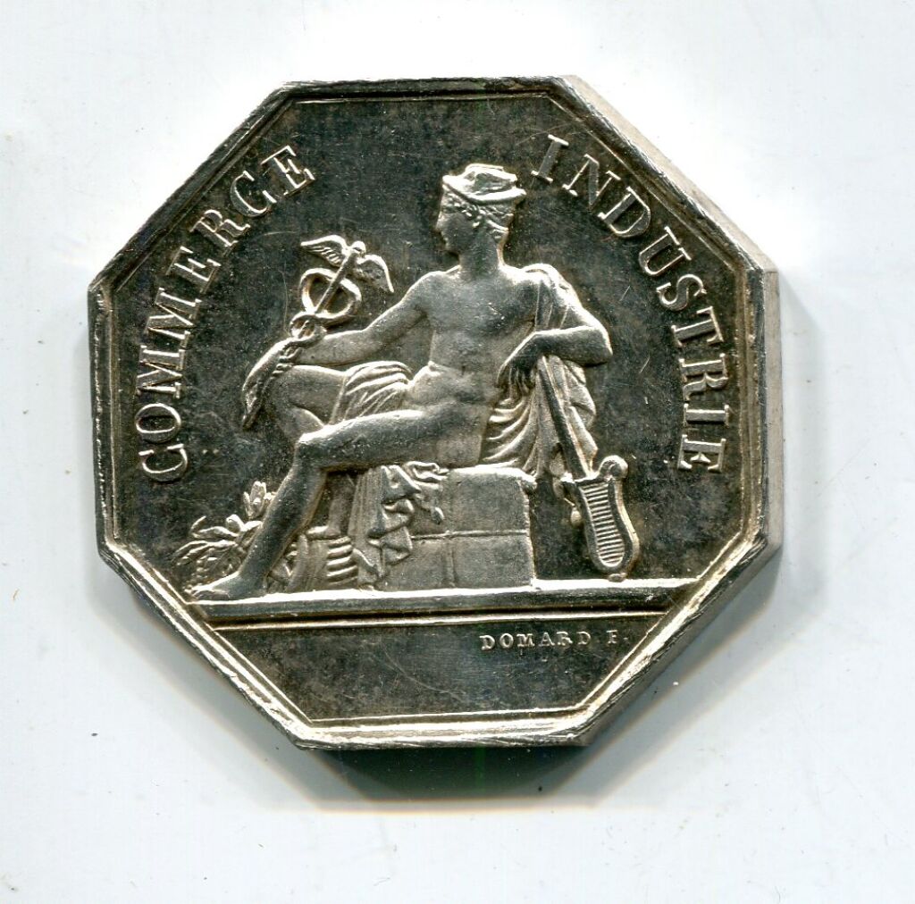 " COMMERCE INDUSTRIE ", Mercure assis à gauche tenant caducée, signé DOMARD. - Revers : titre en centre et pourtour d'une couronne d'olivier - Sur la tranche poinçon main indicatrice - Jeton octogonal 30 mm - 13,42 grammes - L/A n° 1643 - TTB
