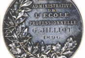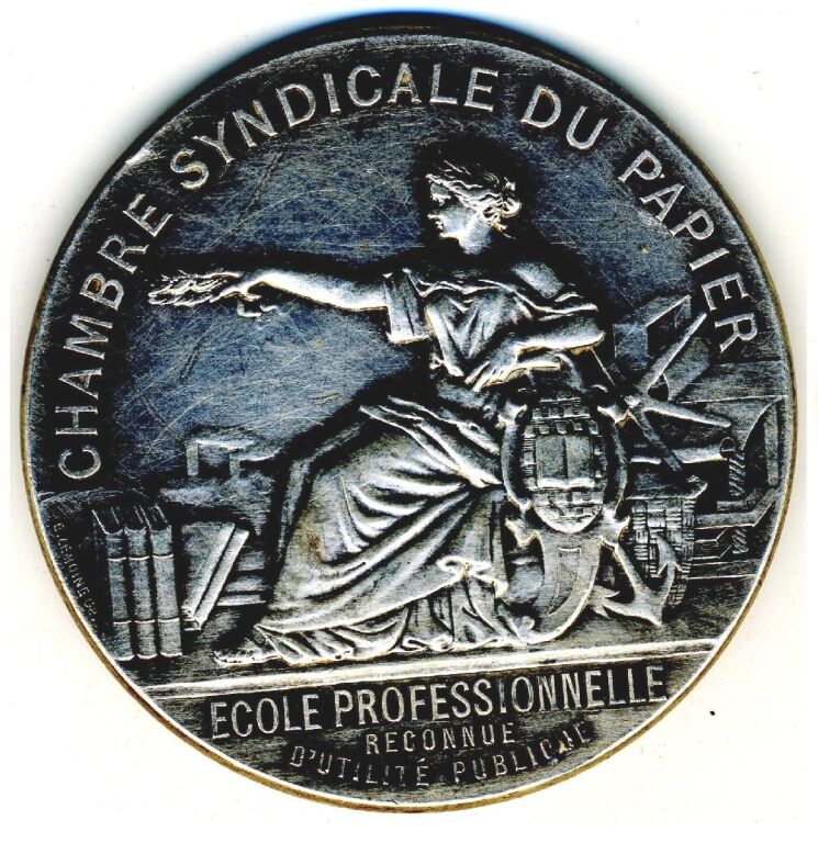 ARGENT - " CHAMBRE SYNDICALE du PAPIER " " École Professionnelle Reconnue d'Utilité Publique " - Femme assise, tête laurée, bras droit tendu et tenant une couronne, vers des usines au loin ; à sa droite presse à imprimer, à ses pieds livres.; à gauche ancre de marine & dame jeanne. OEuvre signée E. LEMOINE - Revers au-dessus de deux grandes palmes de chêne et laurier " commission administrative de l'école professionnelle ", attribution : G. JILLIOT 1896 - sur la tranche poinçons argent 950 et Minerve -