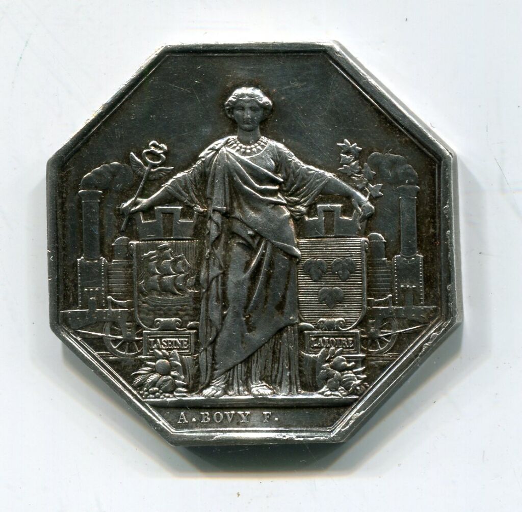 Revers : titre en centre d'une couronne de chêne et d'olivier. Jeton octogonal 36,5 mm.