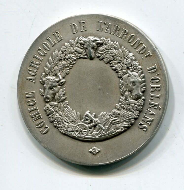 ARGENT - " COMICE AGRICOLE de L'ARRONDISSEMENT D' ORLEANS " médaille de récompense classe argent en argent 36 mm - intérieur de ferme avec basse-cour, au 1er plan femme debout portant un baluchon - Revers : couronne de végétaux et têtes de bœuf, cheval, mouton + charrue ; centre pour attribution. - sur la tranche poinçons argent et sanglier - 22,13 grammes - L/A n° 1137 - TTB