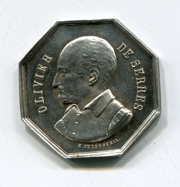 Jeton octogonal CONSEIL D'ADMINISTRATION en centre d'une couronne composée de symboles de l'agriculture : têtes de cheval, bœuf et mouron, charrue, épis de blé, vigne et laurier - à l'avers : OLIVIER DE SERRES ( * ) son buste de profil à gauche. Signature H. DE LONGUEIL sous le buste. - 31 mm - sur la tranche poinçons argent et corne (à partir 1880) - 11,98 grammes - L/A n° 1128. - TTB