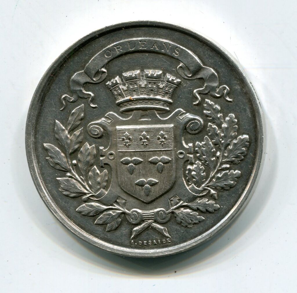 ARGENT - " COMICE AGRICOLE D'ORLEANS " - grande médaille classe argent en argent 45 mm - blason d'orléans couronné entre 2 palmes de chêne et laurier - Au revers, attribution dans une couronne de laurier et chêne : " R. THOREAU 1893 ". - sur la tranche poinçons argent et corne - 47,42 grammes - TTB