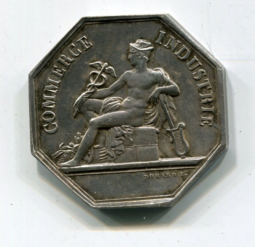 " COMMERCE INDUSTRIE " Mercure assis appuyé sur un gouvernail tenant un caducée, œuvre de DOMARD - au revers texte et date - jeton octogonal 33 mm - 16,88 gr.