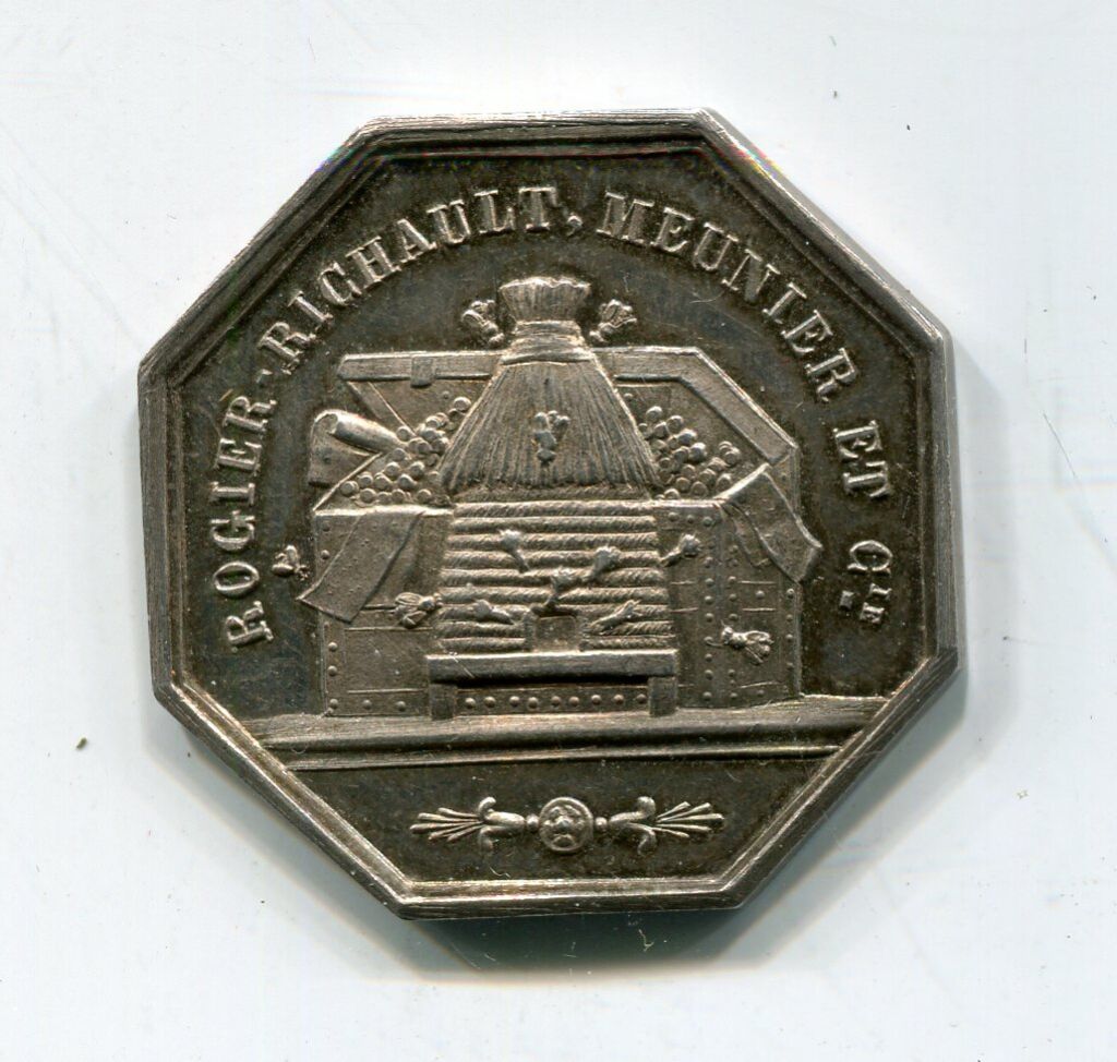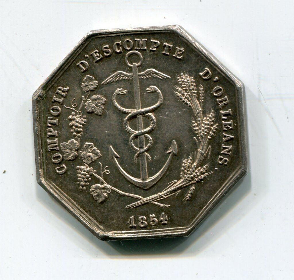 ARGENT - " COMPTOIR D'ESCOMPTE D'ORLEANS 1854 " - ROGIER-RICHAULT, MEUNIER ET Cie - Titre et ruche avec abeilles voletant, placée devant un coffre ouvert laissant apparaitre des monnaies - Revers : titre et ancre formant un caducée entouré de brassées de blé et de feuilles de vigne et grappes de raisin. - sur la tranche poinçons argent et corne - 31 mm - 13,54 grammes - L/A n° 1998 - SUP