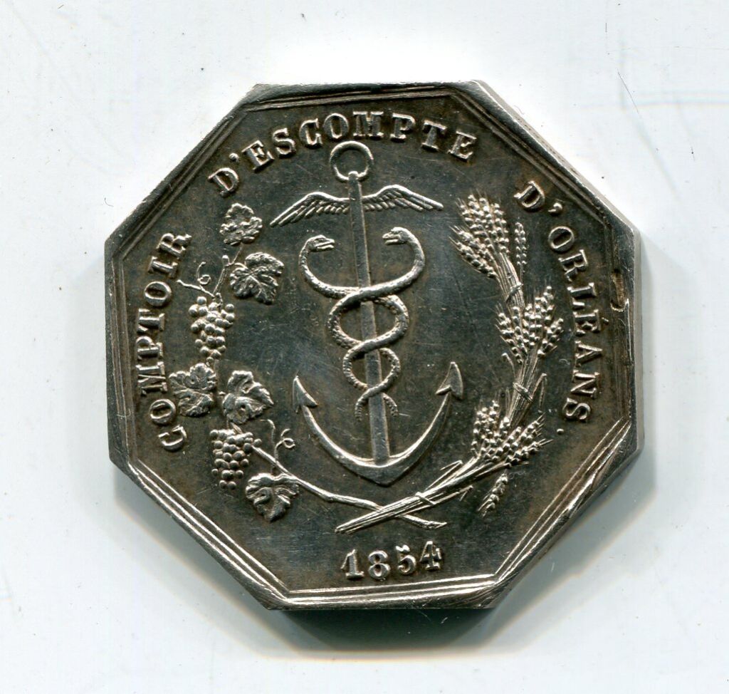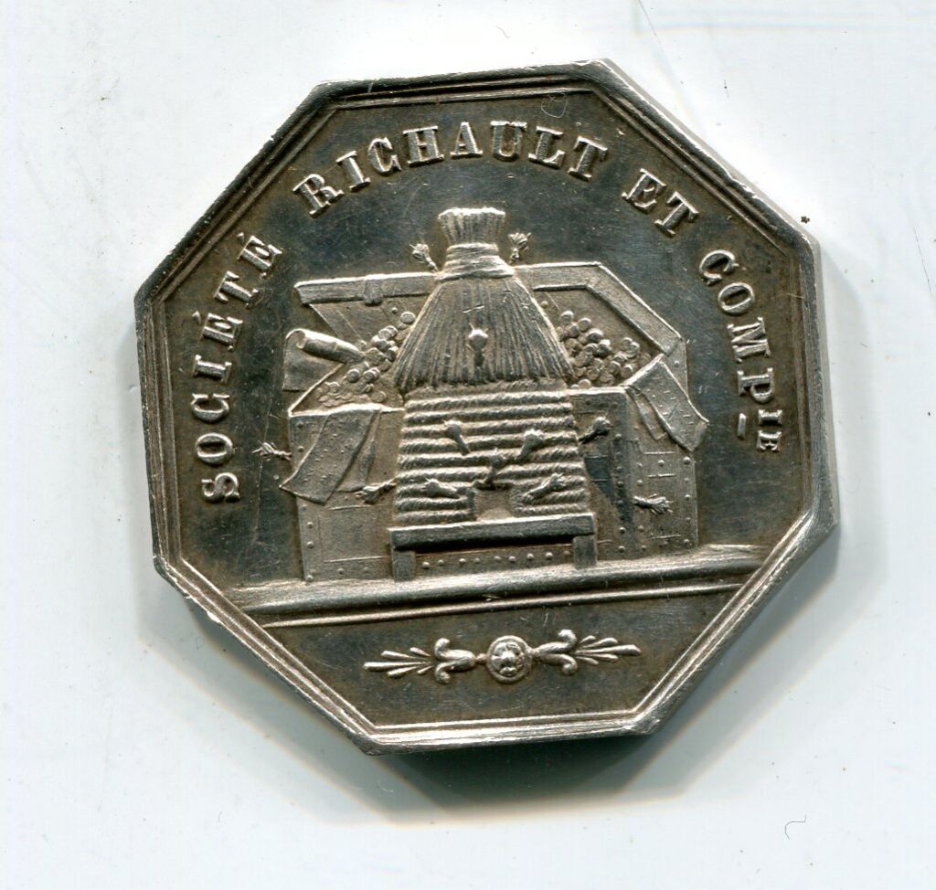 ARGENT - " COMPTOIR D'ESCOMPTE D'ORLEANS 1854 " - SOCIETE RICHAULT ET COMPie - Titre et ruche avec abeilles voletant, placée devant un coffre ouvert laissant apparaitre des monnaies - Revers : titre et ancre formant un caducée entouré de brassées de blé et de feuilles de vigne et grappes de raisin. - sur la tranche poinçons argent et abeille - 30,5 mm - 14,34 grammes - L/A n° 1997 - TTB