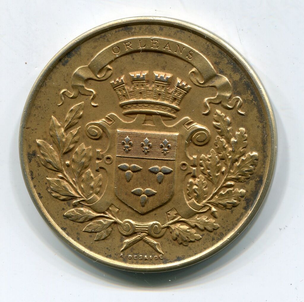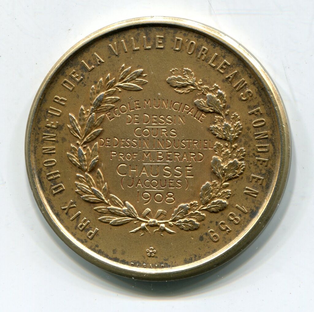 ARGENT DORE - " PRIX D'HONNEUR de la VILLE D'ORLEANS FONDE en 1859 " - Médaille classe OR de " L' ECOLE MUNICIPALE de DESSIN, cours de dessin industriel, Prof. M. Berard " attribution à CHAUSSE Jacques 1908. - à l'avers blason de ville couronné entre 2 palmes. Légende et attribution au revers entre 2 palmes de chêne & olivier.