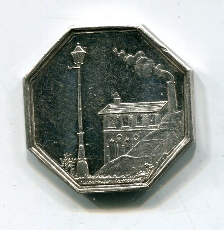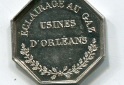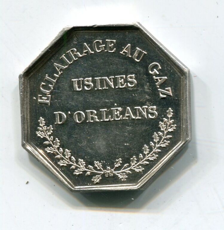 ARGENT - " ECLAIRAGE au GAZ - USINE D'ORLEANS " - Usine fumante à droite, grand réverbère à gauche, fleurs et herbes en parterre - Revers : texte au-dessus de 2 rameaux de feuilles de chêne - jeton octogonal 25 mm - 7,62 grammes. Sur la tranche poinçons argent et main indicatrice (1845 à 1860) - L/A n° 2180 - SUP ECLAT D'ORIGINE