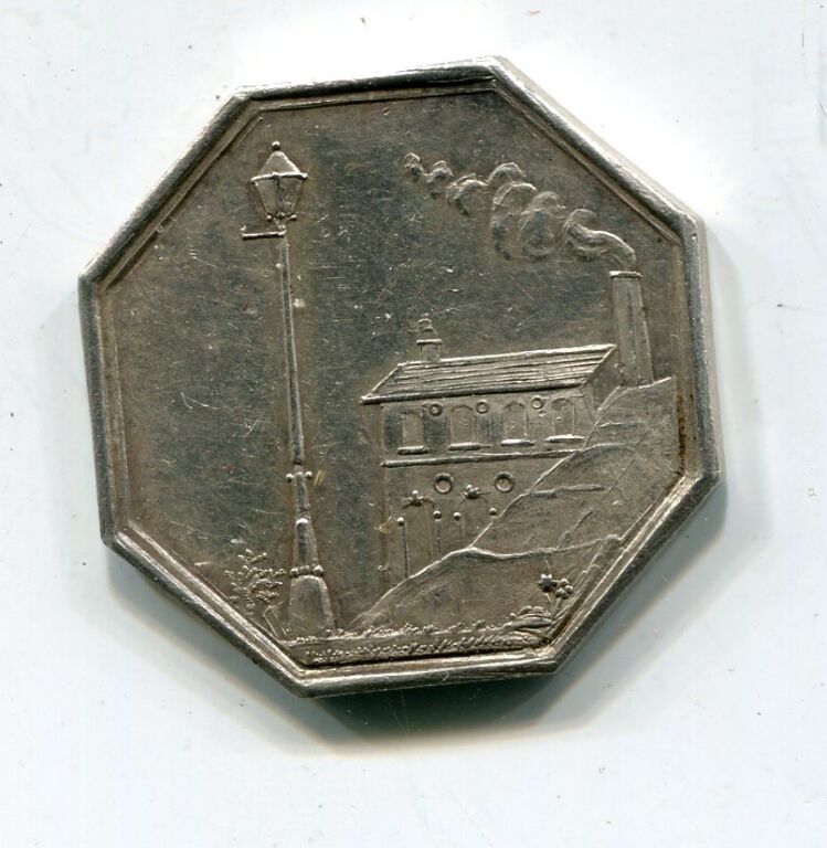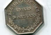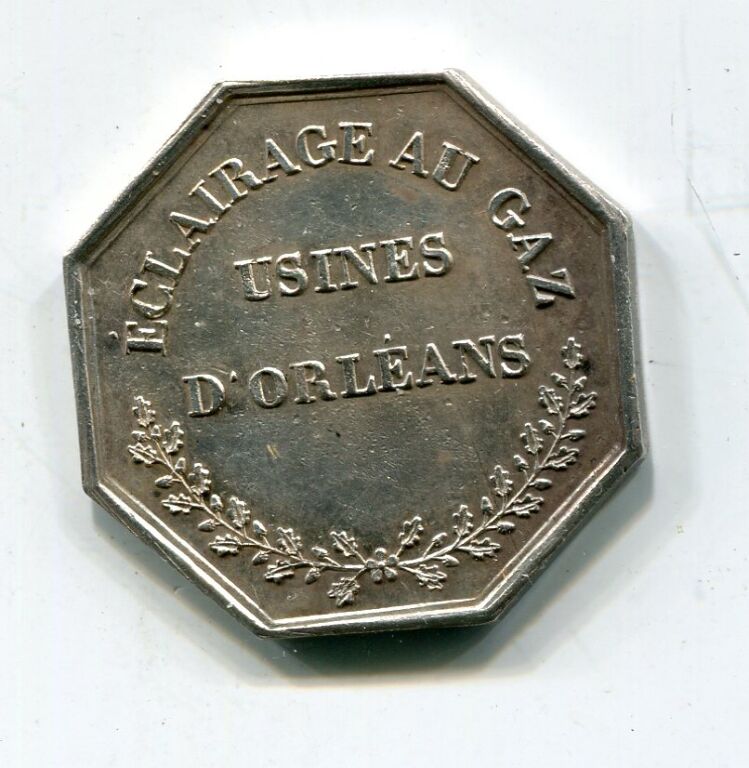 ARGENT - " ECLAIRAGE au GAZ - USINE D'ORLEANS " - Usine fumante à droite, grand réverbère à gauche, fleurs et herbes en parterre - Revers : texte au-dessus de 2 rameaux de feuilles de chêne - jeton octogonal 25 mm - 7,67 grammes. Sur la tranche poinçons argent et proue de navire (1842 à 1845) - L/A n° 2179 - TTB