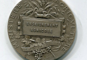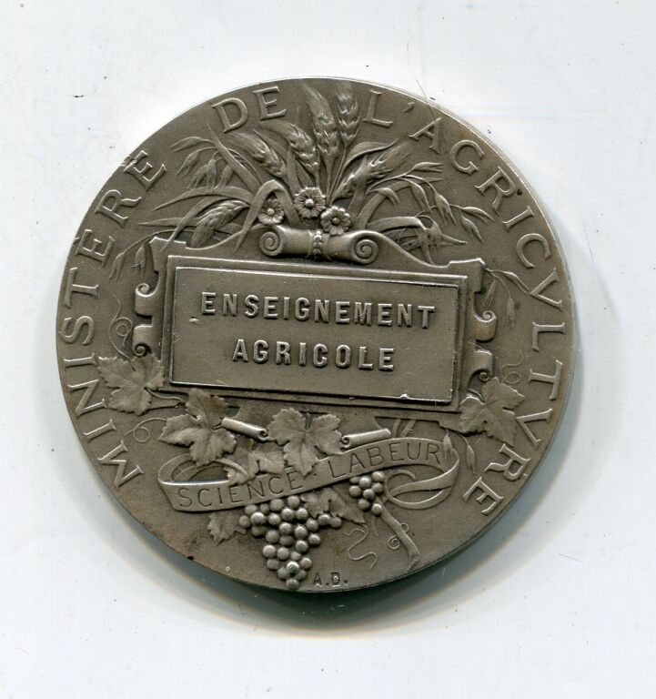 ARGENT - ENSEIGNEMENT AGRICOLE - médaille classe argent en argent 1er titre 950 millièmes - "République Française", le science debout tête laurée, la main droite posée sur un livre, pose la main droite sur l'épaule d'un agricultrice avec gerbe de blé sur l'épaule ; au fond semeur ; œuvre signée Alphée DUBOIS - Revers : " Ministère de l'Agriculture ", écu sur gerbe de blé, feuilles de vigne et grappes de raisin nouées par un ruban légendé "Science - Labeur "- sur la tranche poinçons argent 1 et corne- 40 mm - 36,88 grammes - TTB