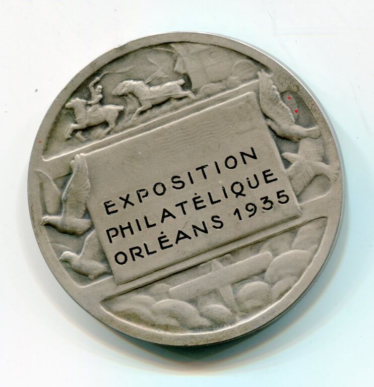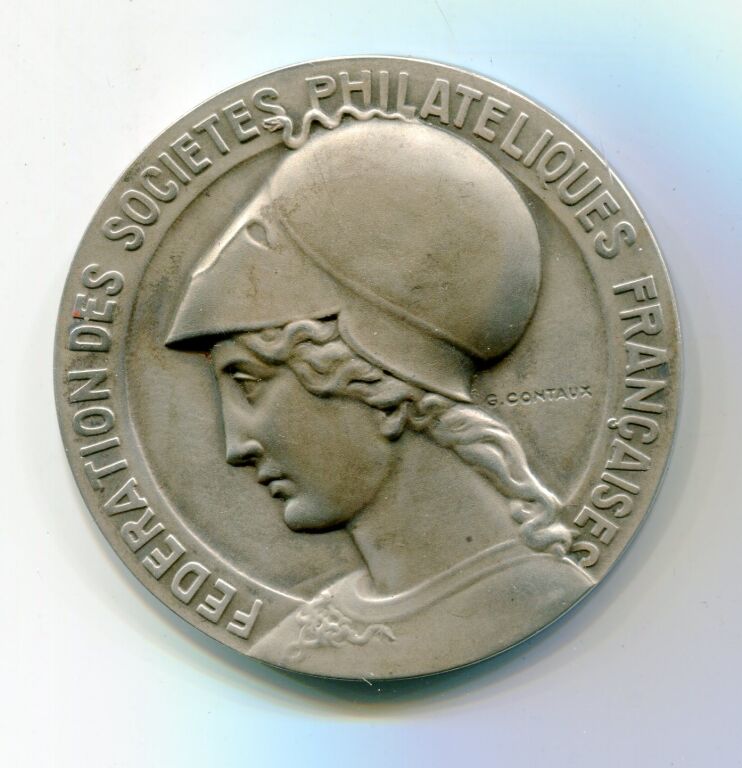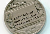 ARGENT - EXPOSITION PHILATELIQUE ORLEANS 1935 - FEDERATION des SOCIETES PHILATELIQUES FRANCAISES - Tête de minerve coiffée du casque corinthien, longue tresse de cheveux dépassant derrière la nuque - œuvre signée G. CONTAUX.
