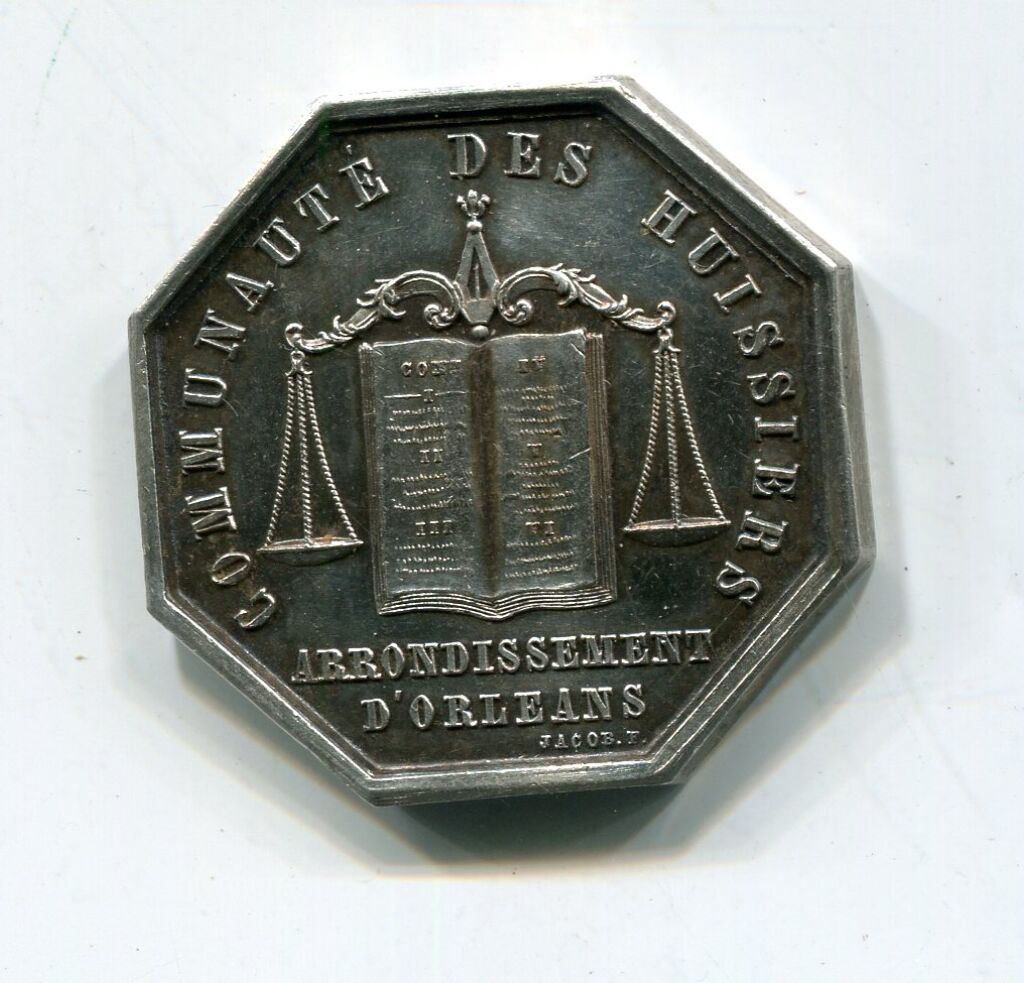 ARGENT - HOMMES de LOIS - 3e République - " COMMUNAUTE des HUISSIERS, ARRONDISSEMENTS D' ORLEANS " - balance et tables de la Loi, signé JACOB.