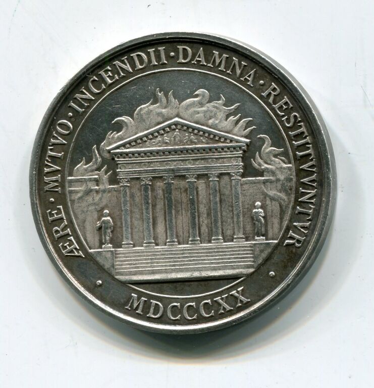 Revers : AERE MVTVO INCENDII DAMNA RESTITVNTVR, temple grec en flammes, cantonné de deux statues - à l'exergue MDCCCXX (1820) - sur la tranche poinçons argent et corne - jeton rond 37 mm - 23,32 grammes - L/A n° 1902 - TTB