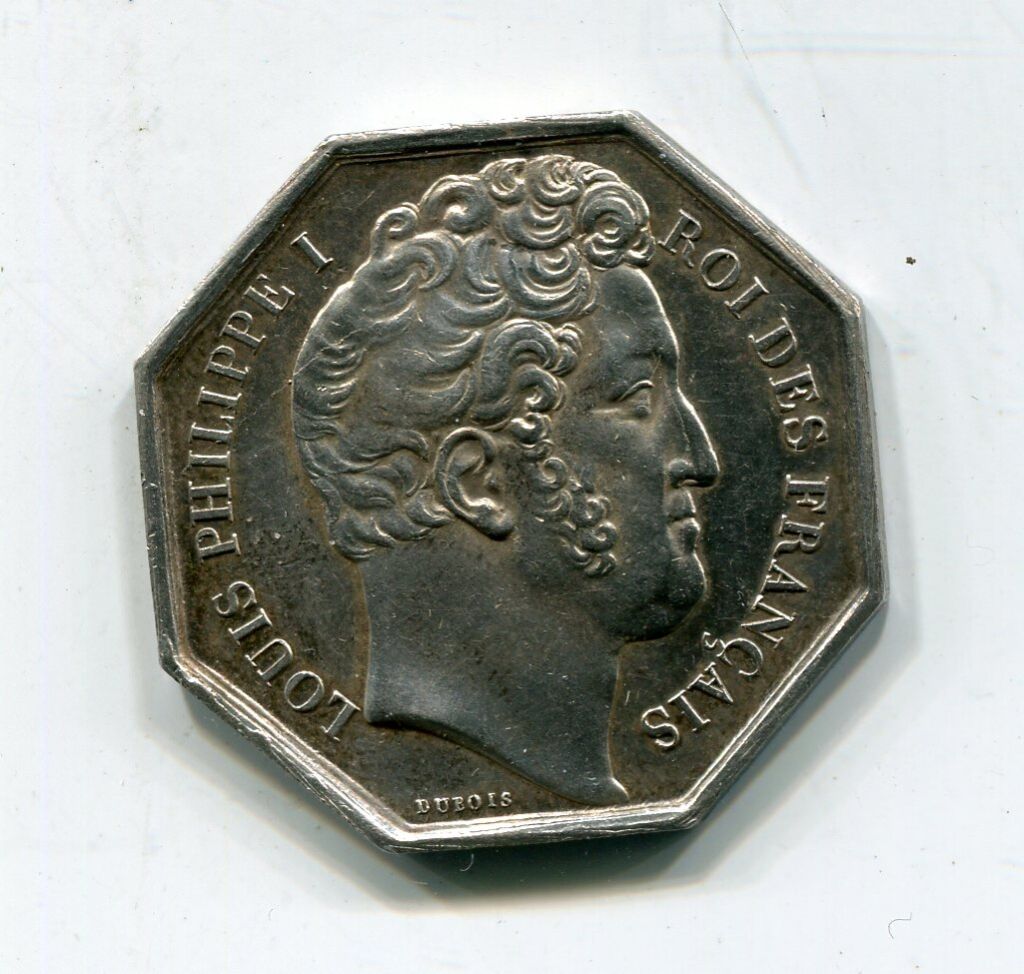 Tête nue du Roi (type grosse tête) , profil à droite signée DUBOIS - Texte au revers entre 2 palmes de feuilles de chêne et olivier. Jeton Octogonal 30 mm. - 12,55 grammes -