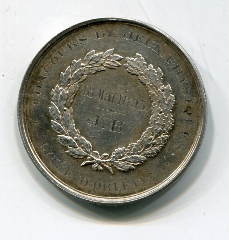 ARGENT - LYCEE D'ORLEANS - CONCOURS de JEUX PHYSIQUES 18 MAI 1893, attribution J.B. - médaille 36,5 mm, poids 19,90 grammes.