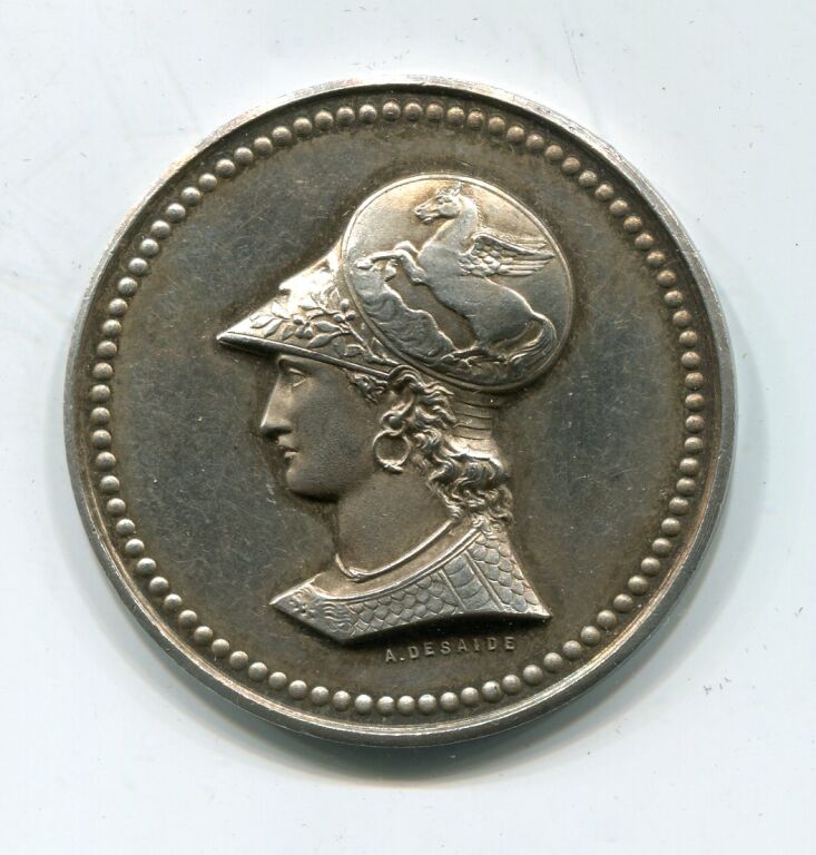 Tête d'Athéna casquée coiffée du casque corinthien avec cheval aillé, belle œuvre signée Alphonse DESAIDE - revers : légende et attribution, couronne de feuilles de chêne et laurier.