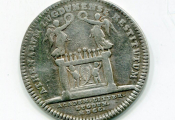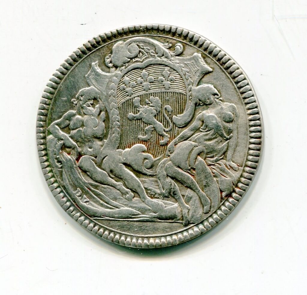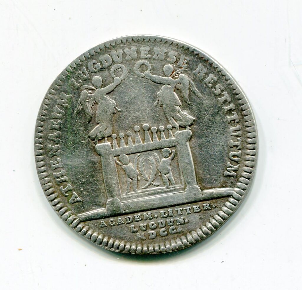 ARGENT - LYON / ACADEMIE des SCIENCES et BELLES LETTRES 1700. Jeton de présence : Sceau de l'académie, armes de la ville de Lyon soutenues par les allégories du Rhône et de la Saône laissant s'échapper l'eau de leurs urnes ; à l'exergue signature D.V. - Revers : ATHENAEUM LUGDUNENSE RESTITUTUM ), autel de Rome et Auguste - à l'exergue date : ACADEM LITTER. LUGDUN. MDCC - RARE variante avec date 1700 en lettres au lieu de chiffres. - 31,5 mm - 9,59 grammes - TTB -