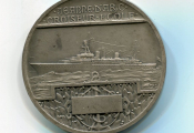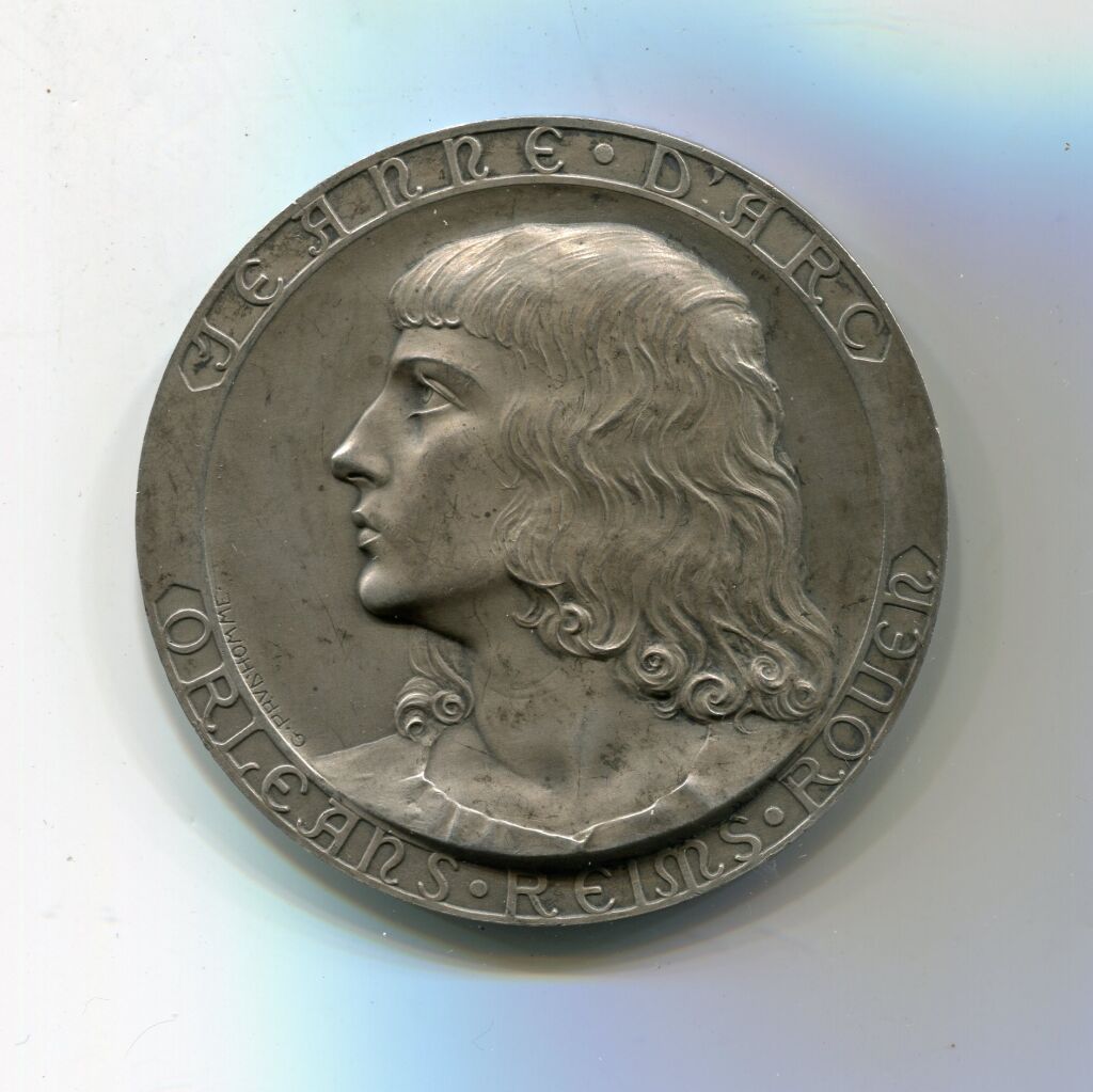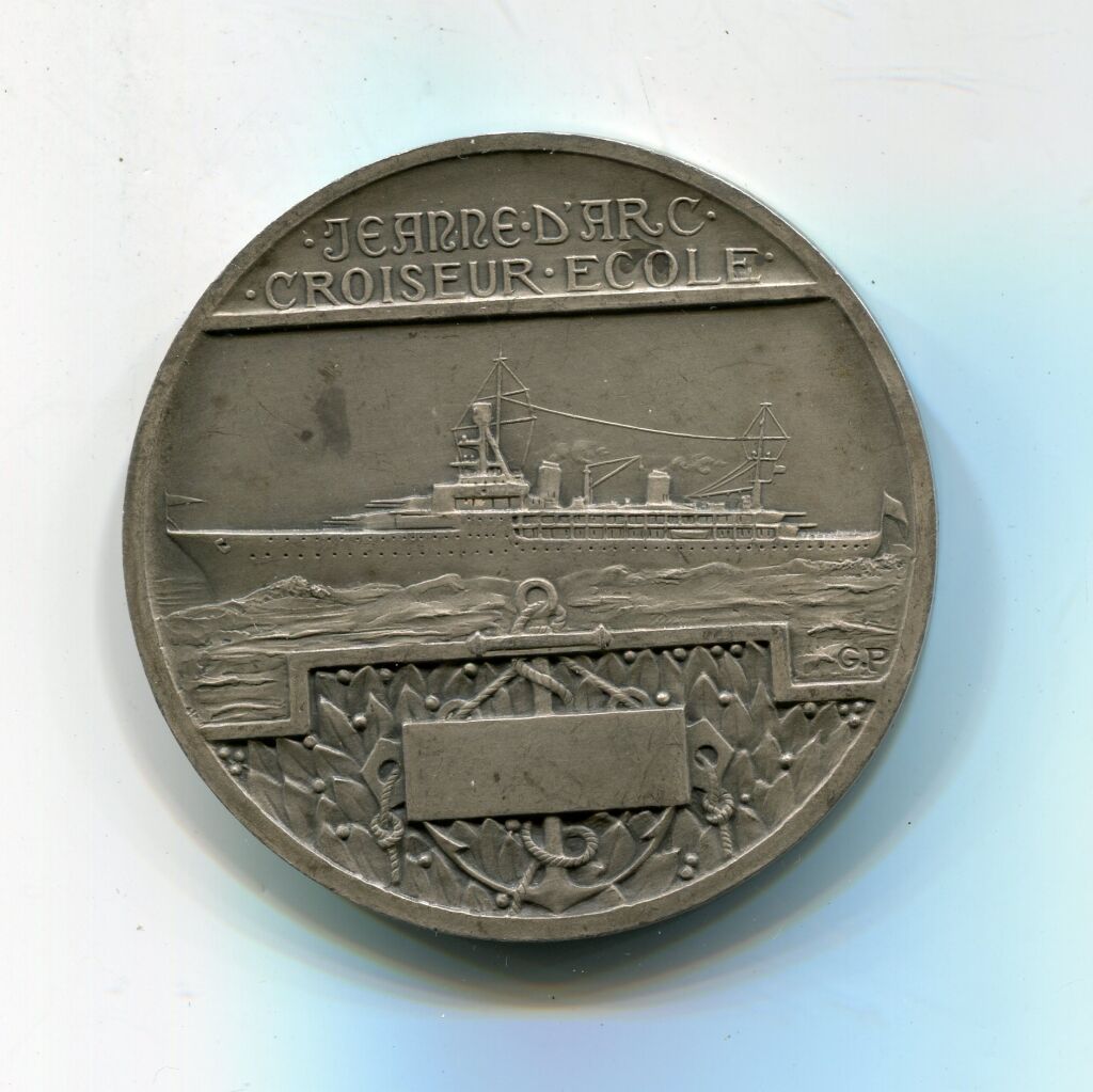 médaille de PRUD' HOMME Jeanne d'Arc de profil aux longs cheveux légende circulaire ORLEANS-RIEMS-ROUEN. - Revers : en haut "Jeanne d'Arc Croiseur École, en bas ancre de marine et rectangle pour attribution - en centre le navire à la mer profil bâbord.