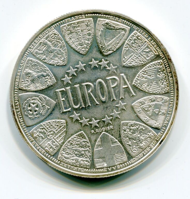 ARGENT - MEDAILLE EUROPA - Douze étoiles et douze blasons représentatifs des douze pays de l' Europe en 1990 - Revers : FRANCE 1990, représentation de la France debout sur carte de l'Europe, elle tient une colombe ailes déployées de la main droite, une branche d'olivier de la gauche ; également colombes en vol dans le champ.