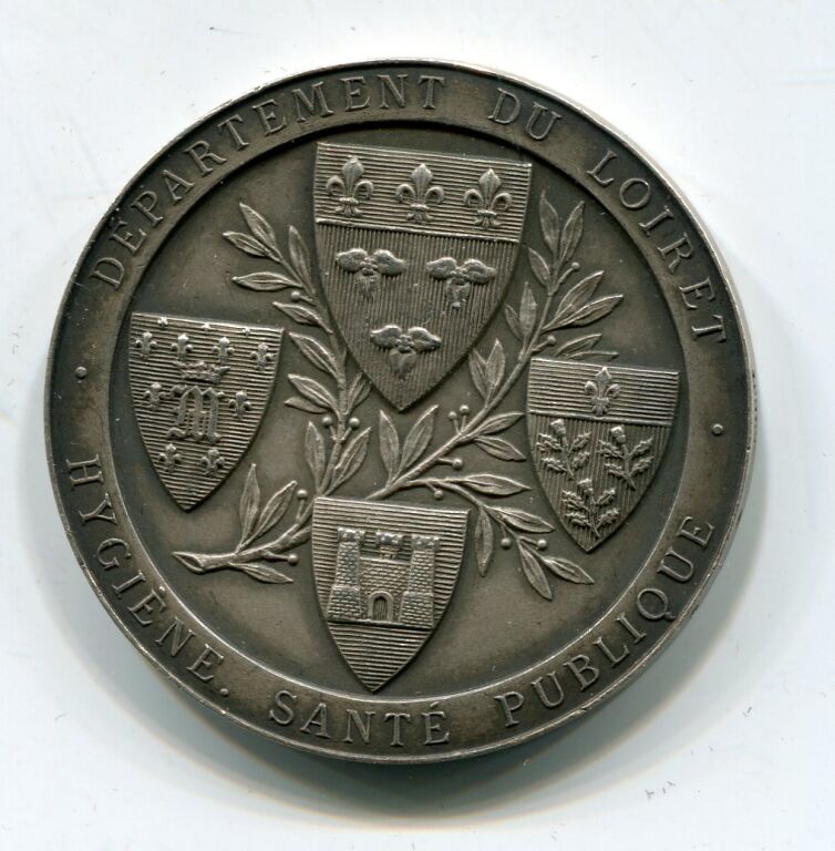 ARGENT - MEDECINE - " DEPARTEMENT du LOIRET / HYGIENE - SANTE PUBLIQUE ", en centre blasons des villes d'Orléans, Montargis, Gien & Pithiviers avec palmes de feuilles d'olivier - Revers : "République Française ", tête, profil à droite, coiffée du bonnet phrygien lauré - 36 mm - mention argent & poinçon sanglier sur tranche - 18,85 grammes - TTB