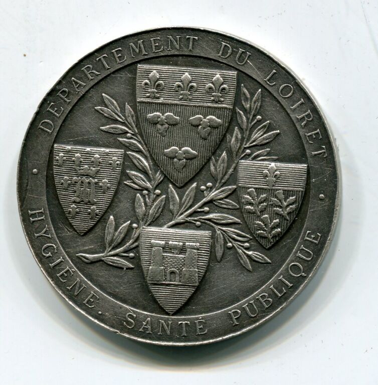 ARGENT - MEDECINE - " DEPARTEMENT du LOIRET / HYGIENE - SANTE PUBLIQUE ", en centre blasons des villes d'Orléans, Montargis, Gien & Pithiviers avec palmes de feuilles d'olivier - Revers : "République Française ", tête, profil à droite, coiffée du bonnet phrygien lauré - 36 mm - mention argent & poinçon sanglier sur tranche - 18,80 grammes - TTB