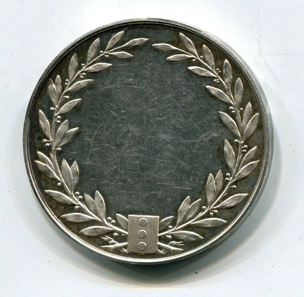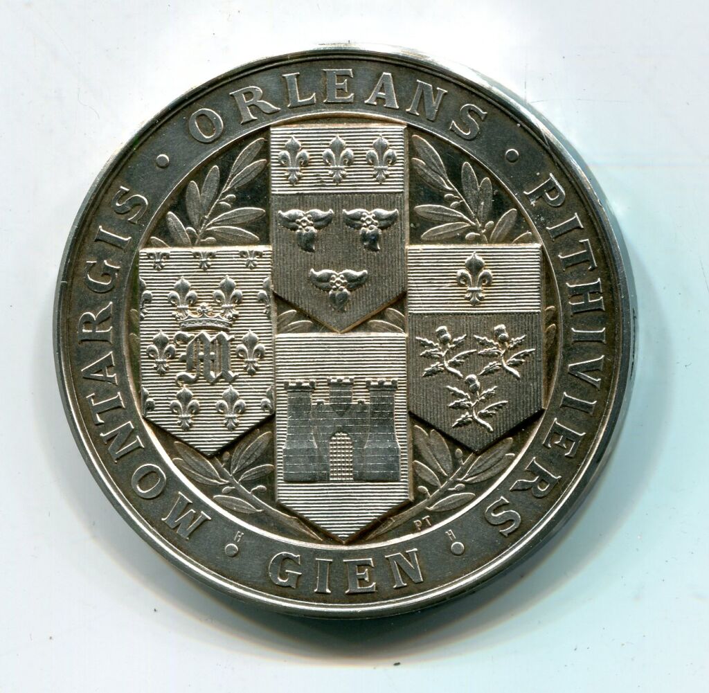 ARGENT - " MONTARGIS - ORLEANS - PITHIVIERS - GIEN " en légende circulaire, en centre armoiries des 4 villes - au dos deux grandes palmes de feuilles d'olivier, centre pour attribution. - Grande médaille de récompense de la Chambre de Commerce du Loiret 45 mm, poinçons argent et corne sur la tranche.- poids 50,82 grammes !- L/A n° 1659 - SUP