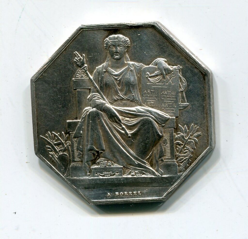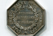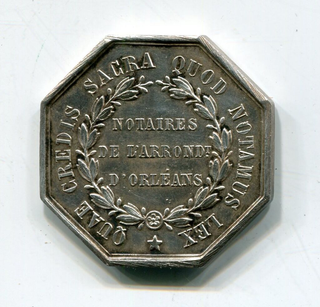 ARGENT - NOTAIRES D'ORLEANS - 3e REPUBLIQUE " - NOUVEAU TYPE : LA JUSTICE, assise de face, la main droite tenant un sceptre, la gauche posée sur les tables de la Loi, tenant main de justice et balance ; autour d'elle différents attributs de profession, signé BORREL - Revers : " QUAE CREDIS, SACRA QUOD NOTAMUS LEX ", titre dans une couronne de laurier reliée à la base par une fleur à 4 pétales. -