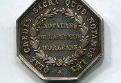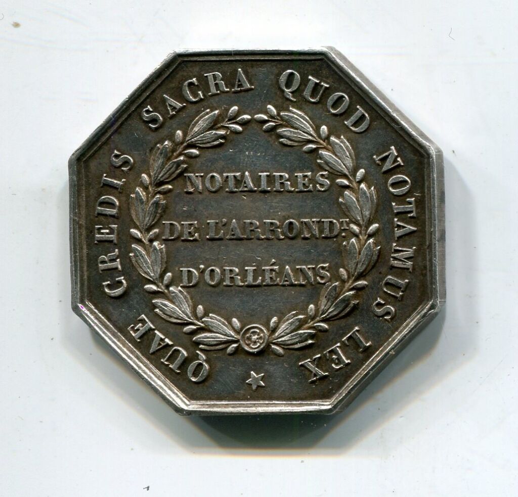 ARGENT - NOTAIRES D'ORLEANS - 3e REPUBLIQUE " REPUBLIQUE FRANCAISE " , tête de la République laurée avec épis de blé, profil à droite, signée PINGRET - Revers : " QUAE CREDIS, SACRA QUOD NOTAMUS LEX ", titre dans une couronne de laurier reliée à la base par une fleur à 4 pétales. - sur la tranche poinçons argent et main indicatrice -