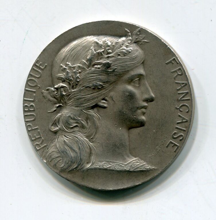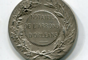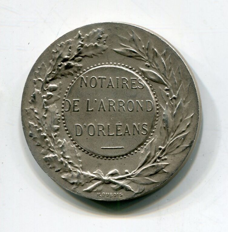 ARGENT - NOTAIRES D'ORLEANS - 3e REPUBLIQUE " - "REPUBLIQUE FRANCAISE", tête de République laurée d'une couronne de chêne et de laurier, profil à droite signé Daniel DUPUIS - Revers : Titre entre 2 palmes nouées de feuilles de chêne et d'olivier par H. DUBOIS.- jeton rond 31,5 mm - 14,70 grammes - sur la tranche poinçon argent 1er titre (950 millièmes) et corne d'abondance - Lerouge 258 - L/A n° 1603 - TTB